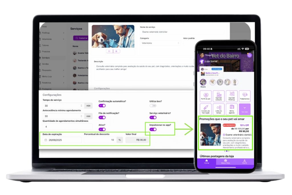 Impulsione suas vendas e engaje mais clientes oferecendo combos de serviços e ofertas direto no aplicativo dos tutores.